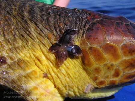 ![]() Conchoderma virgatum anclado a tortuga común Caretta caretta | ||