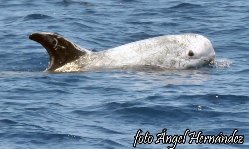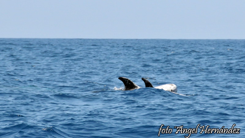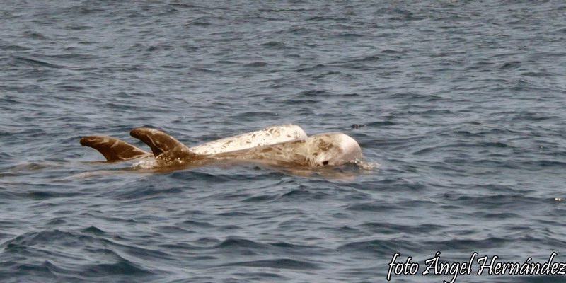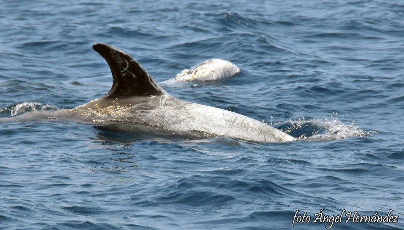 Avistamiento de delfín gris (Grampus griseus) Ficha identificación delfín gris pdf Lugar: Litoral de Buenavista del Norte. Tenerife Fecha: 5 de septiembre de 2012 Referencia & Imagenes: Ángel Hernández La travesía entre las marinas de Los Gigantes y Garachico resultó bastante más interesante de lo que podiamos imaginar en un principio. El patrón del Galathea, pariente y sobre todo amigo, nos invitó a acompañarlo para llevar su intraborda a la recientemente inaugurada infraestructura en la Villa y Puerto de Garachico. Navegar al pie de los acantilados de Los Gigantes, fondear en la playa de Masca, (con chapuzón entre algunas "aguavivas" incluido), doblar la Punta de Teno, y comenzar a navegar en el mar del norte, no dejó de ser interesante; pero la sorpresa la recibimos frente al campo de golf de Buenavista del Norte. Un grupo de cetáceos navegaba plácida y tranquilamente a escasos 50 metros de nosotros. Varios grupos de tres o cuatro ejemplares resoplaban una y otra vez, no dejaban de ser calderones (o al menos eso creimos) hasta que vimos que algunos de estos ejemplares eran blancos (por minutos pensamos que eran albinos), durante minutos -mientras el Galathea aminoró la velocidad de su derrota, para acompasarla a la velocidad de nuestros vecinos de travesía- pudimos observar la majestuosidad de movimientos y el sonido de su respiración. Barco