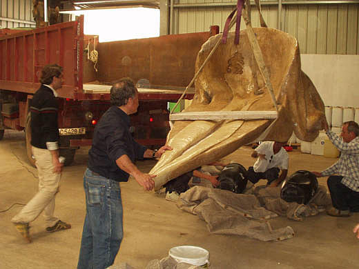 ![]() Farés Sosa (Ayuntamiento de Pájara) y Tony Gallardo (Cabildo de Fuerteventura) en el trabajo de ensamblar la cabeza de cachalote (marzo de 2006) |
