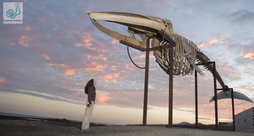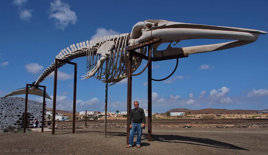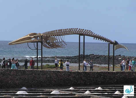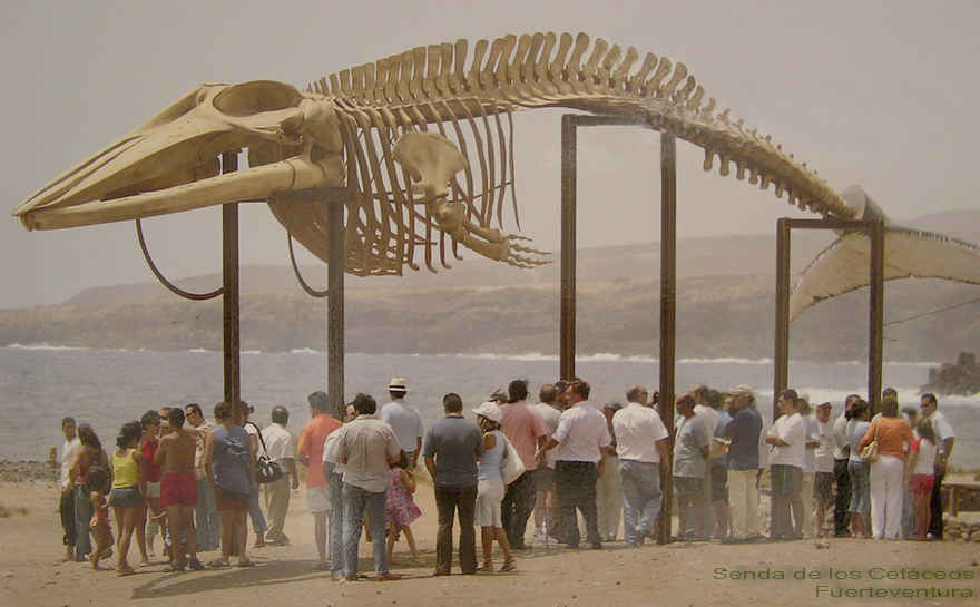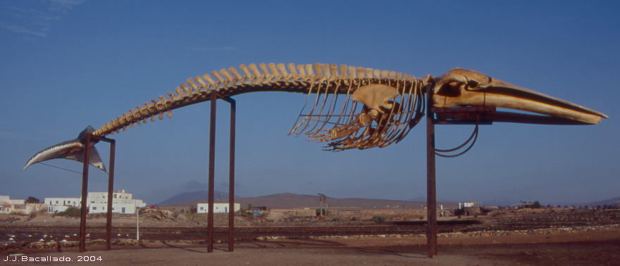 physalus, Linnaeus, 1758) El 14 de abril del 2000, en Majanicho (Municipio de La Oliva) apareció varada sin vida una hembra de rorcual común de 19,5 metros de longitud. Considerando el interés cultural y expositivo del impresionante ejemplar, el Cabildo de Fuerteventura, con la colaboración de la Consejería de Medio Ambiente del Gobierno de Canarias, decide iniciar las tareas necesarias para recuperar el esqueleto y exponerlo publicamente junto al mar, en las Salinas del Carmen.(Antigua). La escultura natural se inaguro en mayo de 2003. |