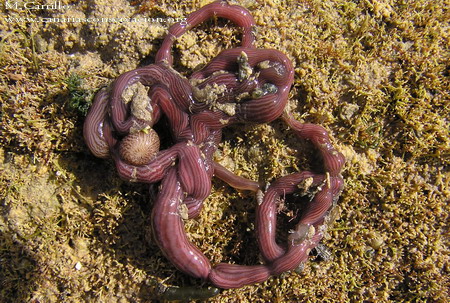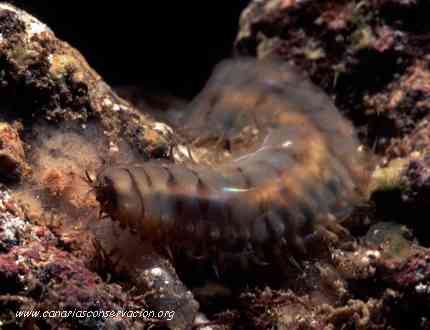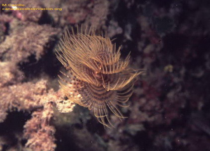 GUSANOS En el medio marino podemos encontrar muchos seres con aspecto de "gusano". Aquí vamos a referirnos a algunos Anelidos (gusanos segmentados), Platelmintos (gusanos planos), Nemertinos (gusanos acintados), Sipuncúlidos (gusanos cilindricos) y Equiúridos (gusanos zanahoria), que aunque no tienen mucho en común comparten la simetría bilateral, el cuerpo compuesto por tres capas celulares y el vivir en el mar Anélidos (Gusanos segmentados) caracterizados por la segmentación del cuerpo en anillos con sedas o quetas, la diferenciación de una cabeza y la aparición de sistemas organizados como el circulatorio, excretor o el nervioso. En el medio marino los Poliquetos, una clase de anélidos muy abundante, presentan un segmento preoral o prostomio y cabeza provista de estructuras especializadas como antenas, ojos, palpos,mandíbulas y cirros. El grupo, dividido artificialmente en organismos sedentarios o errantes, está formado por numerosas especies con representantes en todos los ambientes marinos, aunque la mayor parte pasan desapercibidos por su pequeño tamaño, por vivir bajo piedras, entre las algas o enterrados en la arena. | |||