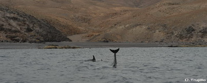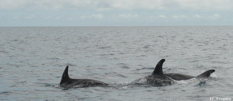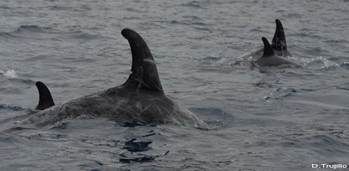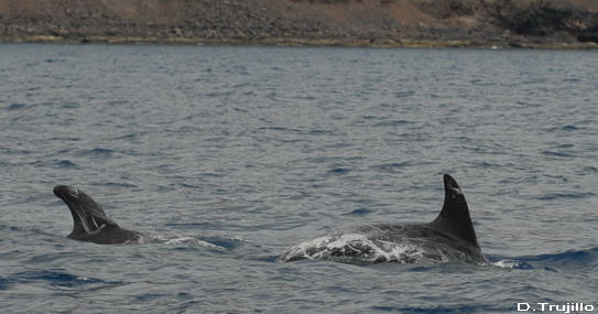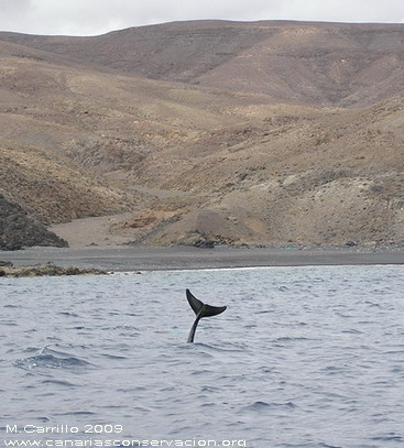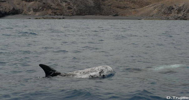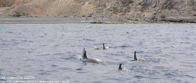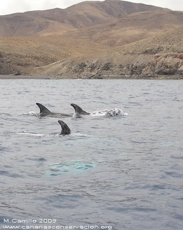 Avistamiento de delfín gris (Grampus griseus) El día 8, uno de los excelentes días de calma que nos ha dejado el mes de octubre de 2009, acompañamos al ornitólogo Domingo Trujillo en una prospección litoral por la costa este de Fuerteventura, desde Puerto del Rosario hasta Gran Tarajal. Su objetivo era localizar señales o nidos antiguos de una rapaz muy arraigada a la cultura canaria, con nombre propio, el guincho (Pandion haliaetus). El guincho o aguila pescadora, su nombre oficial, es un ave conocida en la isla de Fuerteventura, aunque desde hace décadas no se han observado anidamientos. Aunque avistar al guincho requeria navegar muy cerca de costa, lo más cerca posible, limitaba las posibilidades de avistamientos de cetáceos, la oportunidad no dejaba dudas. Preparamos el equipo y pensamos aquello de "mete el dedo en el agua, pruébala, y si es salada pueden aparecer cetáceos" La buena suerte nos acompañó en esta travesía y a la altura de Jacomar, a una profundidad entre 5 y 25 m de profundidad y a escasos 100 metros de la orilla encontramos un grupo de entre 20-25 delfines grises. En la composición del grupo destacaba la presencia de 4 hembras acompañadas por crías muy pequeñas y algunos machos adultos de color casi blanco. Durante el avistamiento los delfines se mostraron indiferentes ante nuestra presencia, con un comportamiento que podía interpretarse como alimentandose, buscando a sus apreciados pulpos con inmersiones constantes. Para disfrute de los presentes también mostraron uno de los comportamientos singulares de la especie: se mantienen inmoviles cabeza abajo dejando fuera el pedúnculo caudal y la aleta. |