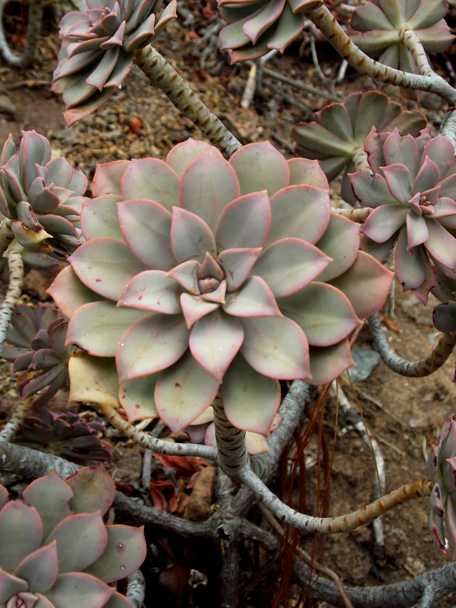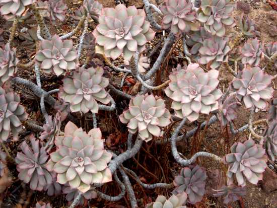 Canarias. Endemismo de la isla de Gran Canaria. Muy abundante. Desde la costa hasta la cumbre. ![]() Telde-Gran Canaria Arbusto ramificado. Rosetas de hojas carnosas de color verde glauco a morado (según la exposición solar) y borde rojo con cilios. Flores con pétalos blancos a rosados | ||